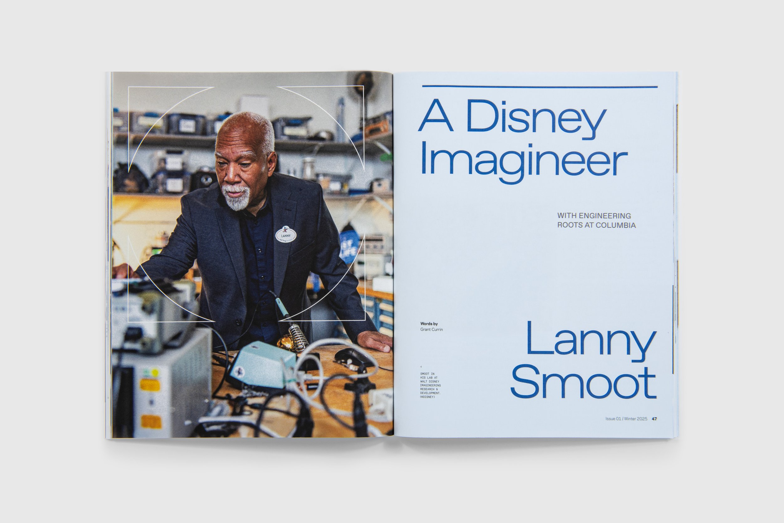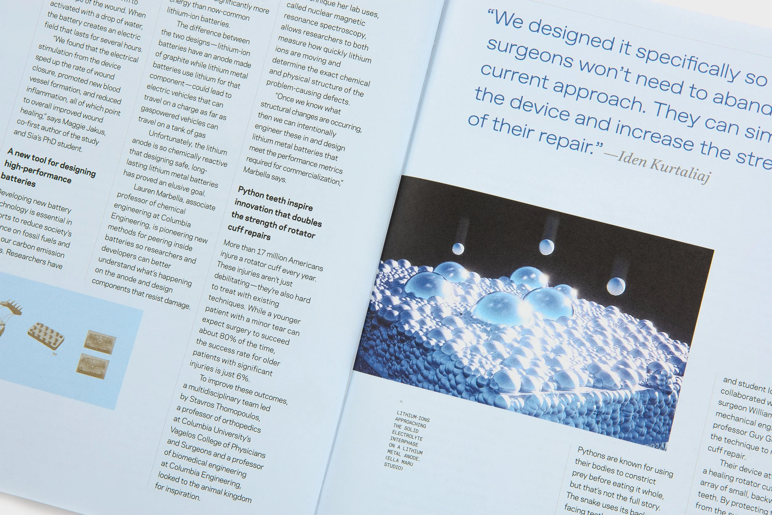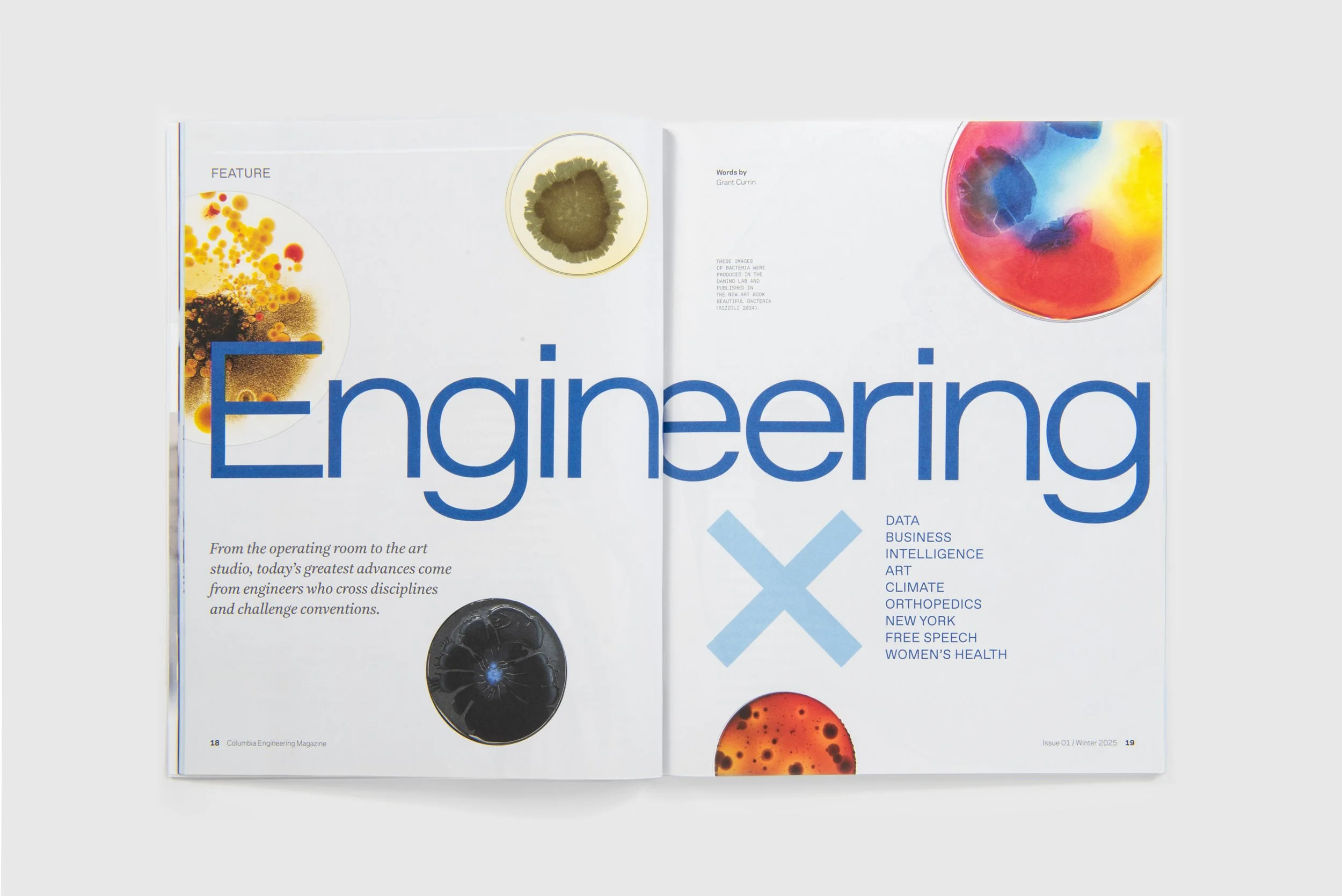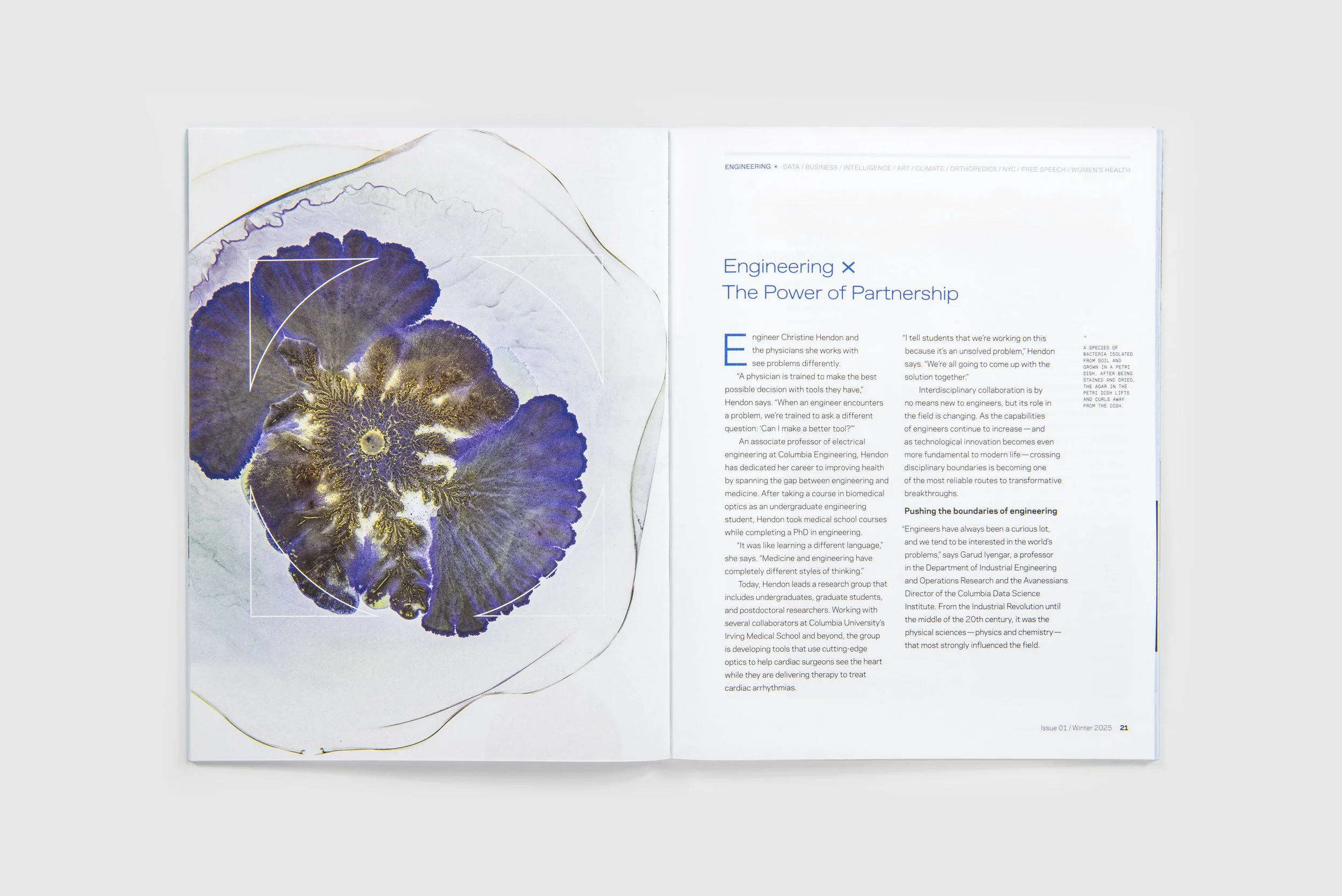Along with a newly established layout and visual system, each year, we work with the Columbia Engineering team to conceptualize the magazine cover and featured story designs with bespoke treatments that carry on through the issue. For these, our goal is to elevate the design ingredients — typography, color, photography — to the level of art, conveying to readers the aesthetic and functional power of engineering to transform a complex world.
