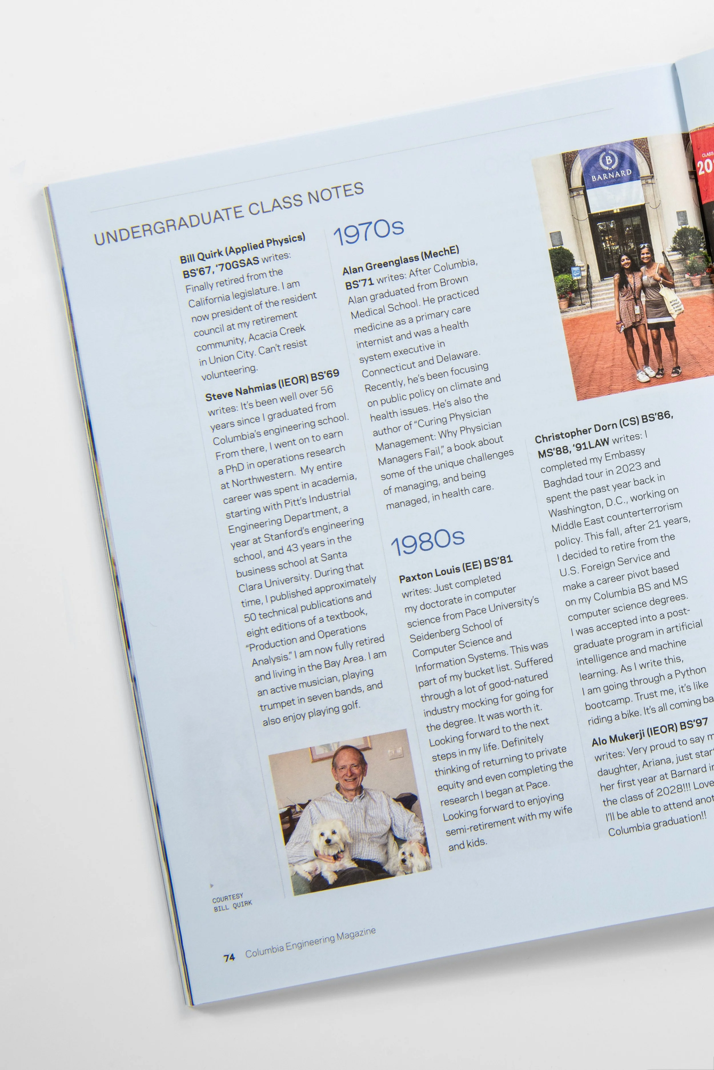 Isometric worked closely with the team at Columbia Engineering to conceptualize and design a wholly updated print alumni magazine and digital newsletter. The new communications materials inform and engage engineering audiences across the United States and around the world with particular emphasis on industry partnerships and alumni engagement. We developed a visual system that foregrounds stories of collaboration and innovation at the school while celebrating alumni achievements and contributions. A new typographic suite and color palette enhances clarity and readability, and a meticulous approach to image treatment and captions adds a visual layer of storytelling. Through the use of scale contrast, pacing, and layered details, the magazine's design creates a communication framework for its thoughtfully curated content.